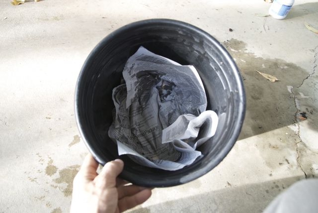 Next, stop up the bottom of the buckets with a single sheet of b&w printed newspaper (hard to find! everything seems to be in color now). This will keep the soil from washing out before the roots take hold, at which point the newspaper will have deteriorated away.