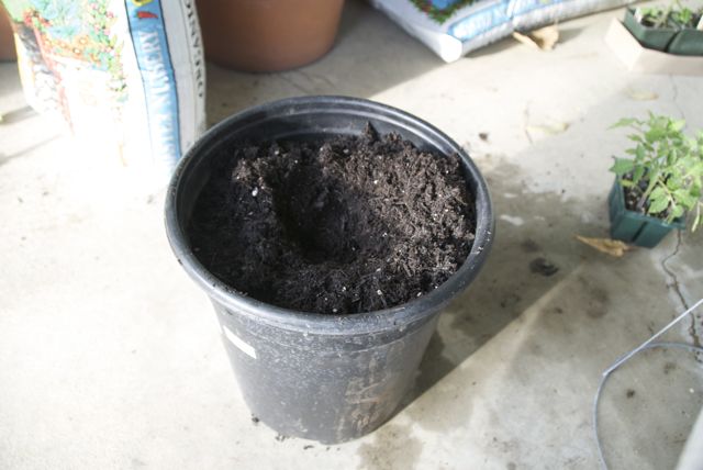 Push the tomato seedling out of the soft plastic planter. This is my favorite part – they pop right out like popsicles, roots soil and everything. Place the into the hole (face up, of course), and push the dirt you dug out back on top of the seedling and compact it down to hold it into place.