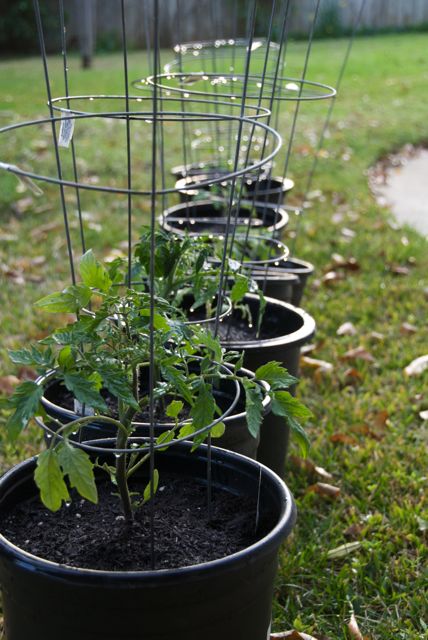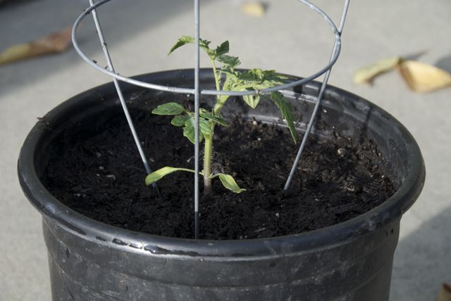 Put the cage over the plant now – you won’t be able to do this once it grows a bit – they get big fast. The cages I have are small because I’m using buckets, and they will ultimately need to be supplemented with stakes.