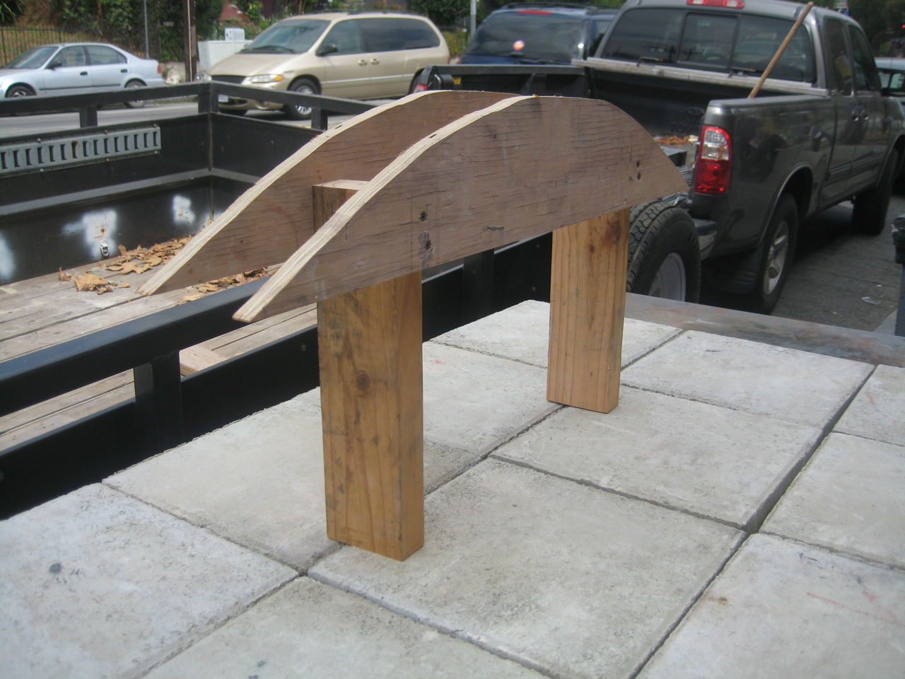 The archway is formed on top of the jig, starting from the back. Put the bricks on from both outside edges, moving inwards.