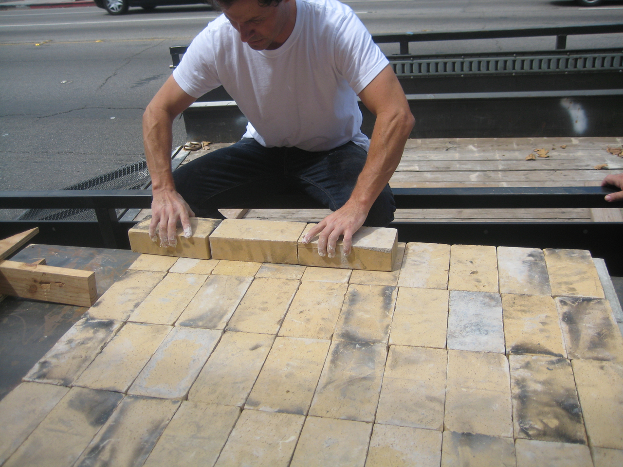 On top of the pavers, lay down a tight-fitting pad of fire bricks. Keep them as even as possible–this will be the floor of the oven.