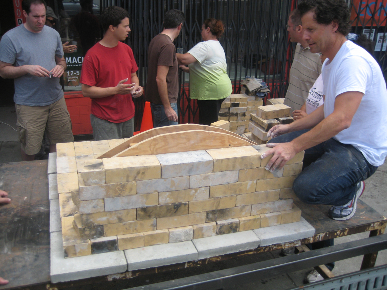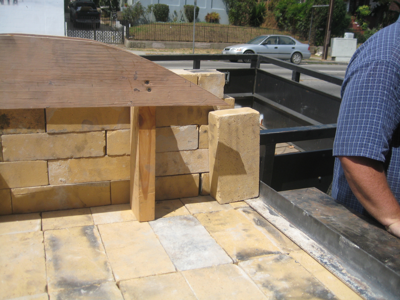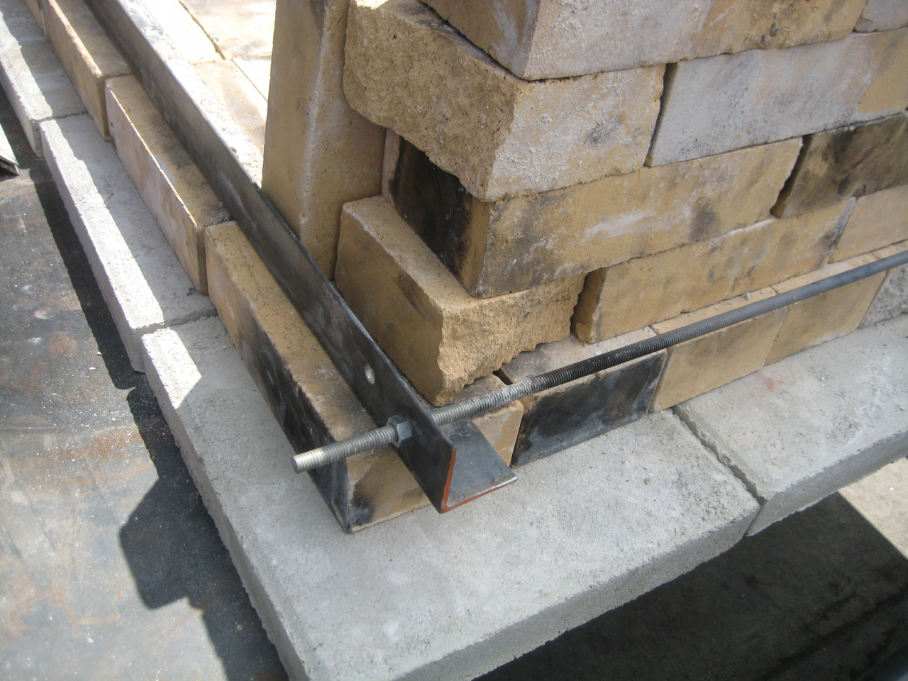 Before removing the jig, place another layer of bricks onto the sidewalls and lock them in place with angle iron, as done on bottom. Once done, the jig can be shimmied out to let the brick arch settle into place.