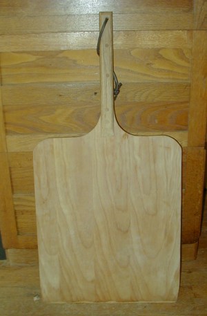 Most of the wooden peels you’ll find in the restaurants and stores have a wide paddle area with a simple tapered edge, extending about 3/4″ around the perimeter, top and bottom. The paddle itself consists of strips of soft wood, glued together, with an unstained finish. Sizes can vary from a few inches in diameter to rectangular beasts that are nearly 2’x3′, without the handle.
